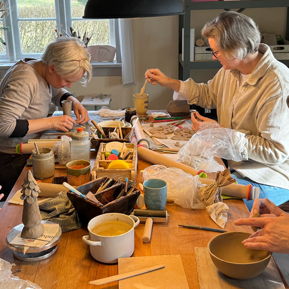 Vi starter ca. kl. 10 med lidt kaffe/the og snack i min lille keramik butik/værksted, hvor I kan finde inspiration til det efterfølgende arbejde i værkstedet.
