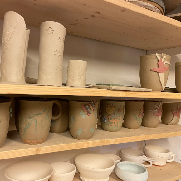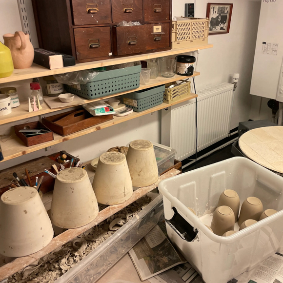 Vi starter i min lille keramik butik, hvor I kan finde inspiration til det efterfølgende dekorationsarbejde i værkstedet.
